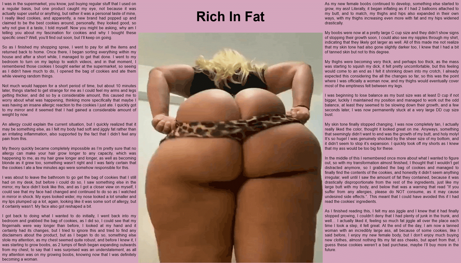 As I finished reading this, I felt my ass jiggle and I knew that it had finally stopped growing, I couldn’t deny that I had plenty of junk in the trunk, and well… I actually liked it, feeling so much fat jiggle all over the place each time I took a step, it felt great. At the end of the day, I am now a tanned woman with an incredibly large ass, all because of some cookies, like I said before, I enjoy my new female body, but I don’t enjoy much buying new clothes, almost nothing fits my fat ass cheeks, but apart from that, I guess these cookies weren’t a bad purchase, maybe I’ll buy more in the future.