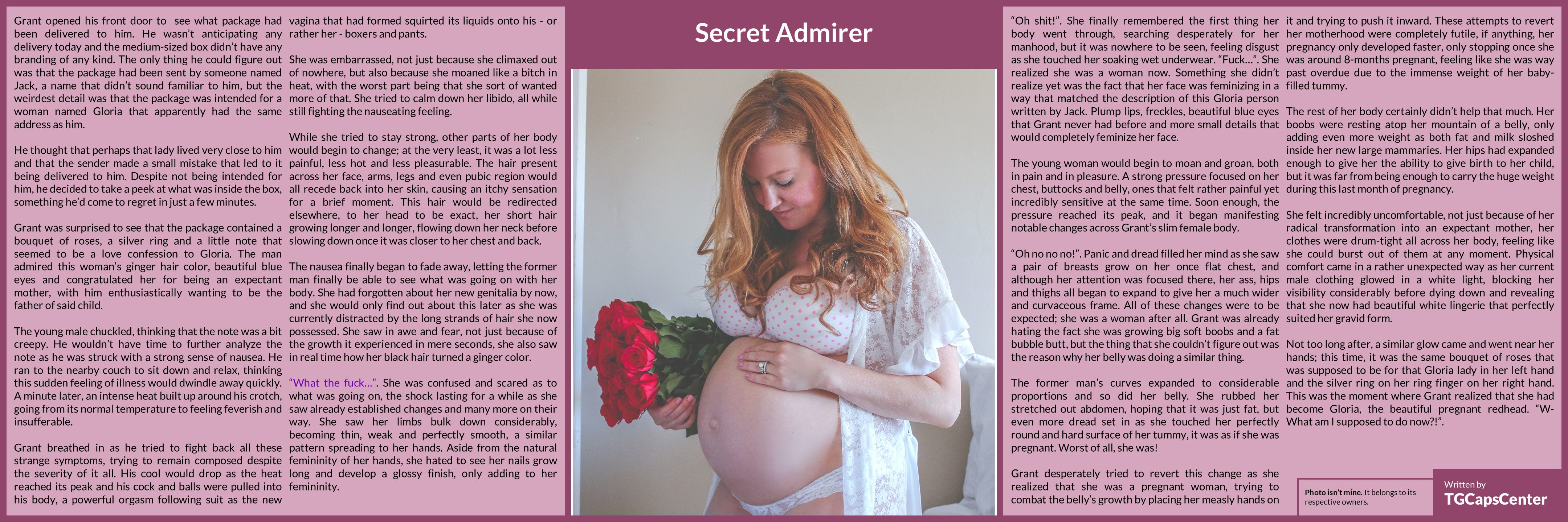 The former man’s curves expanded to considerable proportions and so did her belly. She rubbed her stretched out abdomen, hoping that it was just fat, but even more dread set in as she touched her perfectly round and hard surface of her tummy, it was as if she was pregnant. Worst of all, she was!