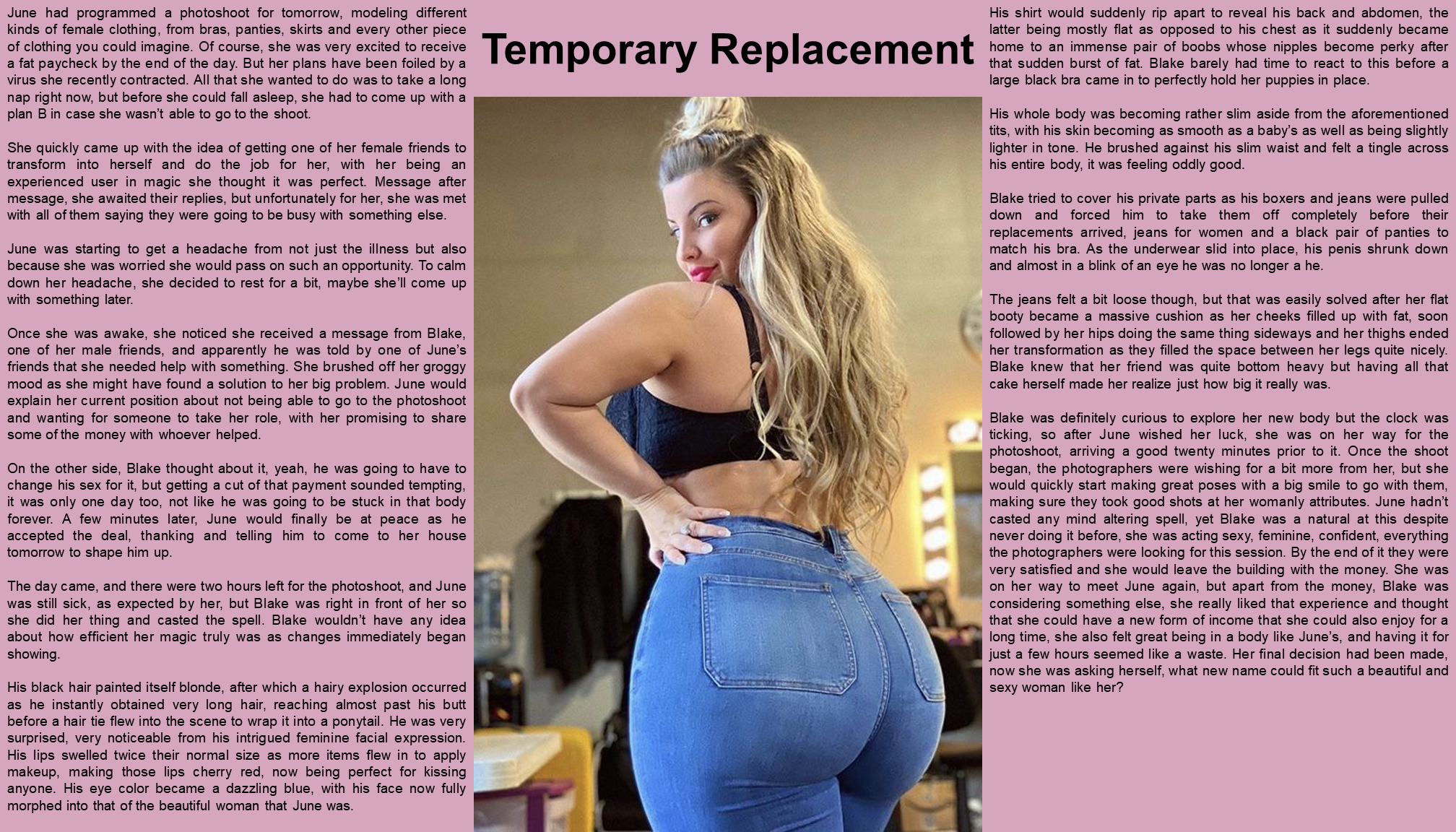 Blake was definitely curious to explore her new body but the clock was ticking, so after June wished her luck, she was on her way for the photoshoot, arriving a good twenty minutes prior to it. Once the shoot began, the photographers were wishing for a bit more from her, but she would quickly start making great poses with a big smile to go with them, making sure they took good shots at her womanly attributes. June hadn’t casted any mind altering spell, yet Blake was a natural at this despite never doing it before, she was acting sexy, feminine, confident, everything the photographers were looking for this session. By the end of it they were very satisfied and she would leave the building with the money. She was on her way to meet June again, but apart from the money, Blake was considering something else, she really liked that experience and thought that she could have a new form of income that she could also enjoy for a long time, she also felt great being in a body like June’s, and having it for just a few hours seemed like a waste. Her final decision had been made, now she was asking herself, what new name could fit such a beautiful and sexy woman like her?