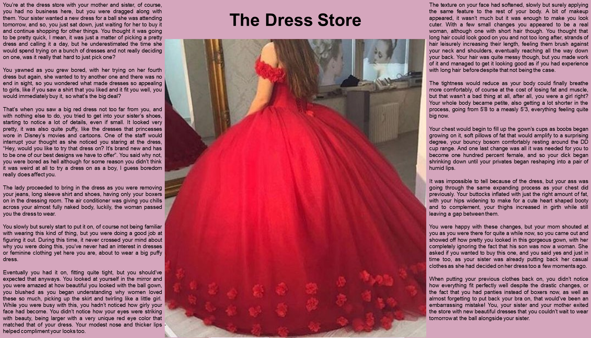Thatâs when you saw a big red dress not too far from you, and with nothing else to do, you tried to get into your sisterâs shoes, starting to notice a lot of details, even if small. It looked very pretty, it was also quite puffy, like the dresses that princesses wore in Disneyâs movies and cartoons. One of the staff would interrupt your thought as she noticed you staring at the dress, âHey, would you like to try that dress on? Itâs brand new and has to be one of our best designs we have to offerâ. You said why not, you were bored as hell although for some reason you didnât think it was weird at all to try a dress on as a boy, I guess boredom really does affect you.