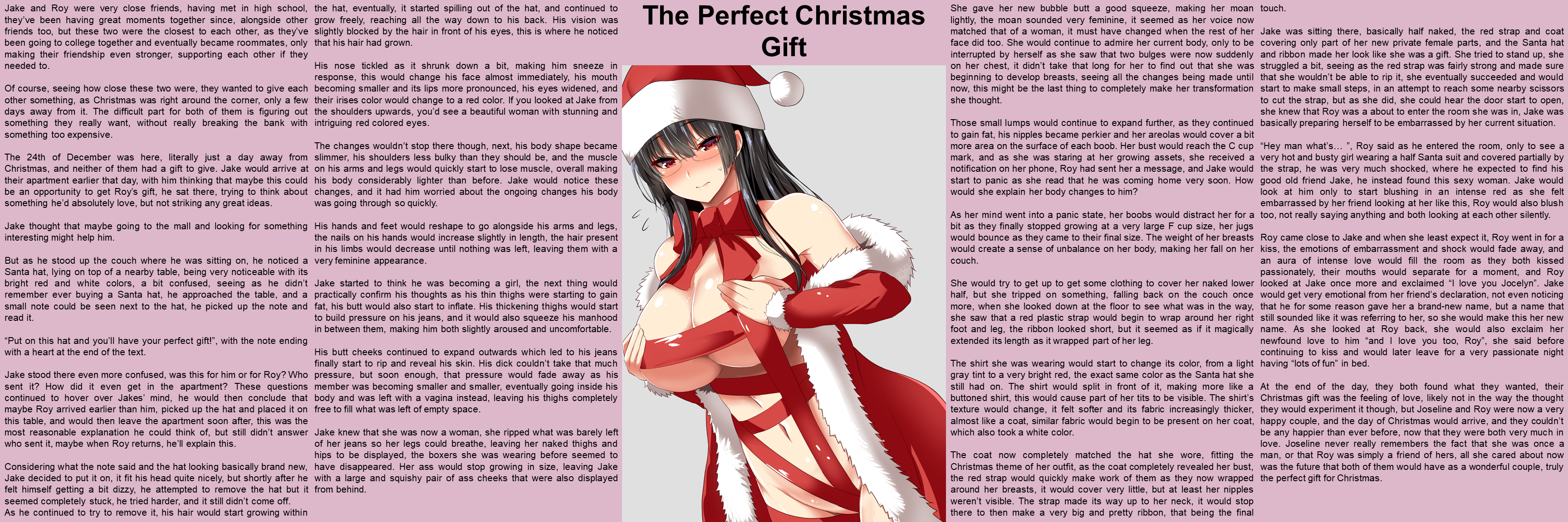 Jake was sitting there, basically half naked, the red strap and coat covering only part of her new private female parts, and the Santa hat and ribbon made her look like she was a gift. She tried to stand up, she struggled a bit, seeing as the red strap was fairly strong and made sure that she wouldn’t be able to rip it, she eventually succeeded and would start to make small steps, in an attempt to reach some nearby scissors to cut the strap, but as she did, she could hear the door start to open, she knew that Roy was a about to enter the room she was in, Jake was basically preparing herself to be embarrassed by her current situation.