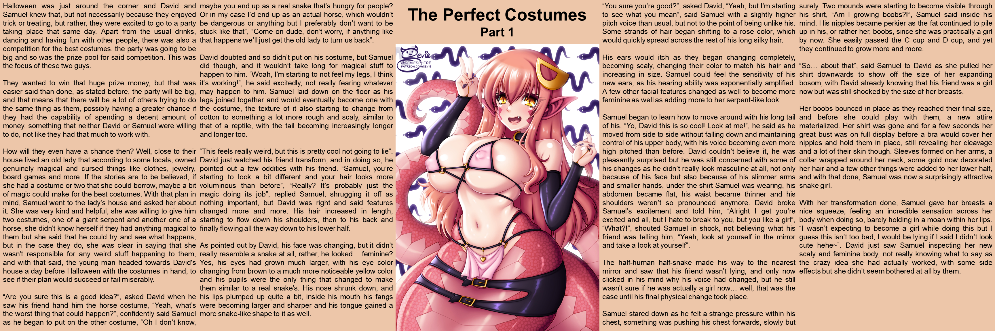 Her boobs bounced in place as they reached their final size, and before she could play with them, a new attire materialized. Her shirt was gone and for a few seconds her great bust was on full display before a bra would cover her nipples and hold them in place, still revealing her cleavage and a lot of their skin though. Sleeves formed on her arms, a collar wrapped around her neck, some gold now decorated her hair and a few other things were added to her lower half, and with that done, Samuel was now a surprisingly attractive snake girl.
